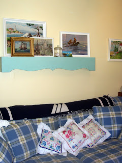 This curtain valance had my name on it. The funny thing is that I really dislike wooden valances over windows, but I love this as a shelf. It was even already painted this great sea blue color. It's hard to tell in the photo, but the plaid in the sofa has some of the same color running through it. Side note: I'm actually keeping my eye out for a white slip cover for the sofa. Here's a close up of the valance/shelf